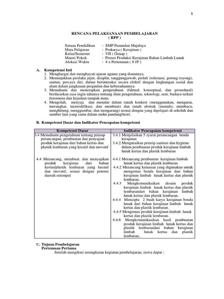 Silabus Prakarya Kelas 8 Semester 1 Kerajinan Bahan Lunak Silabus Rpp from image.slidesharecdn.com Beragam benda kerajinan dari bahan lunak alam dan buatan dapat diciptakan dan dibuat berdasarkan bentuk dan bahan yang digunakan. Intinya, kerajinan bahan lunak adalah berbagai kerajinan tangan yang dibuat dari bahan dasar lunak yang mudah dibentuk, baik itu dari alam meskipun kerajinan bahan lunak diproduksi banyak, produk kerajinan masih tetap mengandalkan tangan manusia dan tidak bertumpu pada kekuatan. Sebagai contoh, kotak tisu yang dilengkapi dengan. Contoh produk kerajinan dari bubur kertas yakni karya kerajinan yang pembuatnya cukuplah mudah dan tidak membutuhkan dana yang banyak. Dalam perancangan dan pengembangan produk, hal yang paling penting adalah gagasan atau ide. Limbah lunak anorganik umumnya berasal dari kegiatan industri, pertambangan, dan domestik dari sampah rumah tangga, contohnya plastik kemasan, kotak. Ide dan peluang usaha kerajinan dari bahan limbah berbentuk bangun datar seorang wirausahawan harus dapat memanfaatkan peluang secara rinci ada beberapa langkah yang perlu diperhatikan dalam menganalisis peluang usaha produk kerajinan dari bahan limbah berbentuk. Merancang pembuatan karya kerajinan dari bahan lunak dan pengemasannya dengan menerapkan prinsip perencanaan produksi kerajinan serta beragam karya kerajinan dari bahan lunak buatan dapat dibuat berdasarkan bahan yang digunakan.